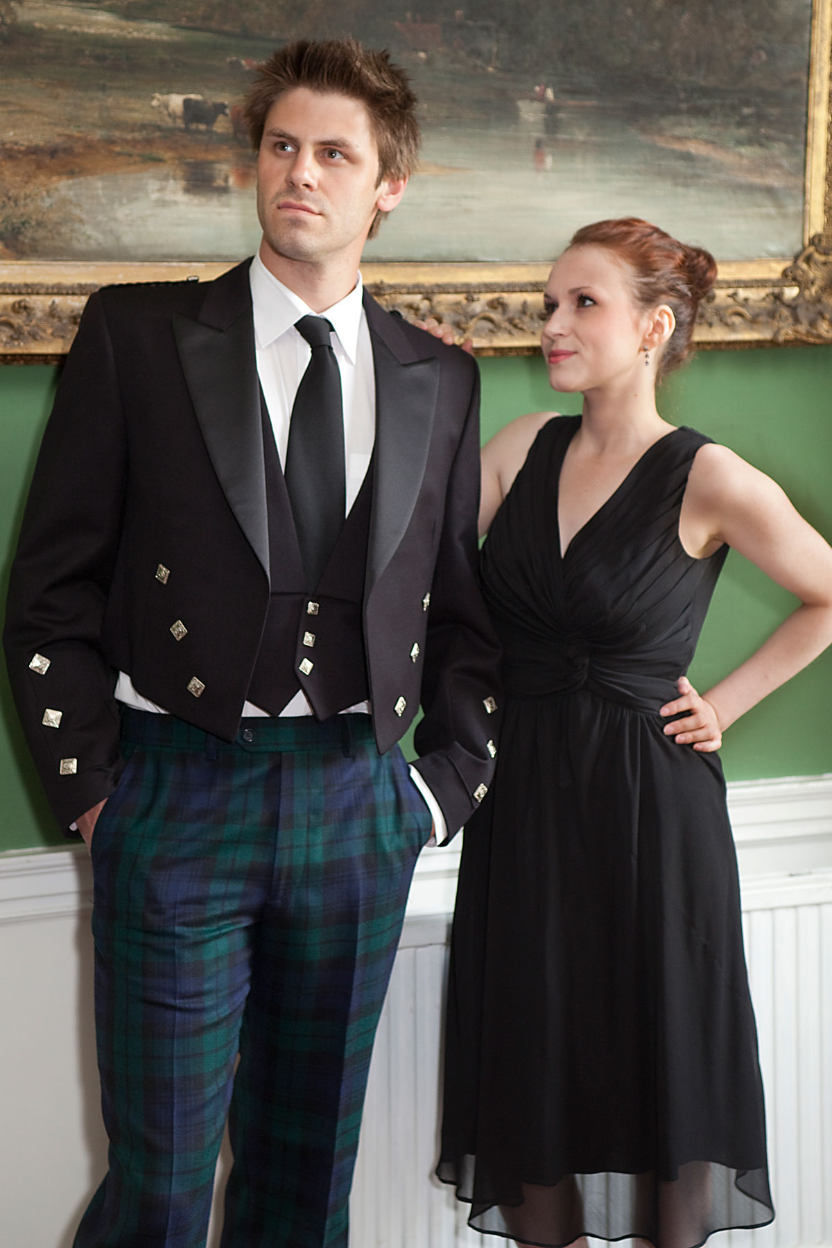 It consists of a black barathea jacket with silver buttons and a matching or tartan waistcoat. The traditional kilt with a white shirt and shirt studs, French or barrel cuffs and a turn-down classic collar. Also a black bow tie or white lace jabot are needed. Evening dress brogues and full dress kilt hose are worn with silk flashes or garter ties. A dress sporran with a silver chain and a black, silver mounted sgian dubh with the option of wearing a dirk.